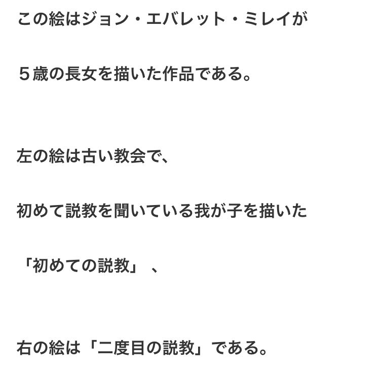 ミレーの「はじめてのお説教」(一枚目)でパッチリ目を開いて立派にお話を聞いている子が可愛かったんだけど、続編の「二度目のお説教」(2枚目)で寝落ちしててさらに可愛かった