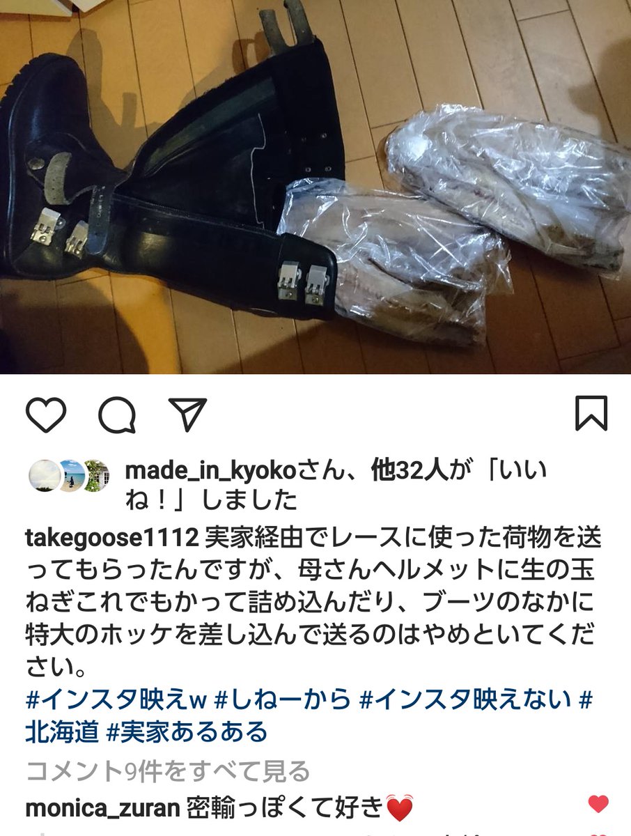 実家からバイク用のブーツ送って貰った時はホッケががっつり差し込まれて、ヘルメットに生の玉ねぎが。 https://t.co/d4zOvQUFjw