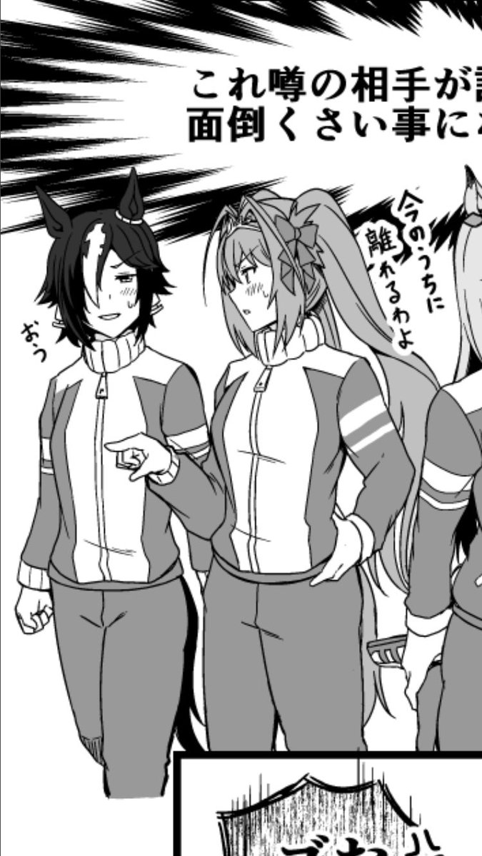 この後顔を真っ赤にしながら「ごめんなさいね…」ってエアグルーヴさんに謝るズズカさんと「良いんだ。気を付けて(いちゃいちゃして)くれれば…」ってちょっと目を逸らしながら答えるエアグルーヴさん。そしてたまたま真相を知った下級生たちが『トレスズを見守る会』を結成するところまで見えました。