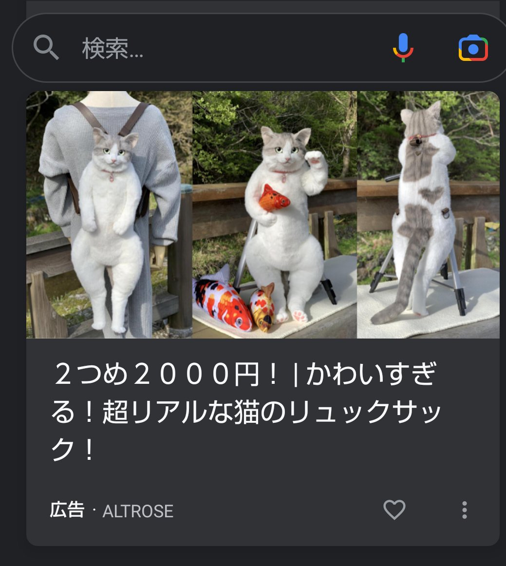 数日前から猫リュックの注意喚起を見掛けるようになったんだけど、今朝Googleの広告で出てきて「これか!」となった。