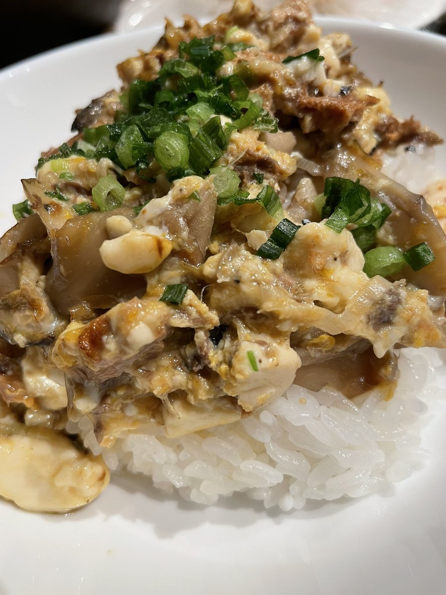 サバ缶を豆腐から出る水分で煮て卵でとじるだけで甘辛味が最高な丼作れます サバ缶を豆腐から出る水分で煮て卵でとじるだけで甘辛味が最高な丼作れます