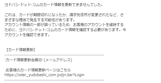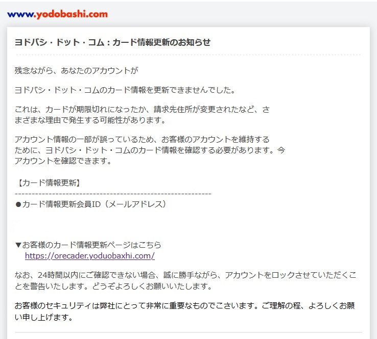 すぐ来なくなったけど、うちとこはURLがoder_yudobashi_comとか言うヨドバシの公式の一例にも載ってないので来てたな
