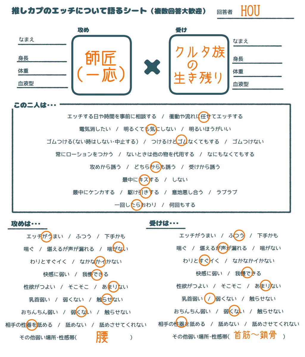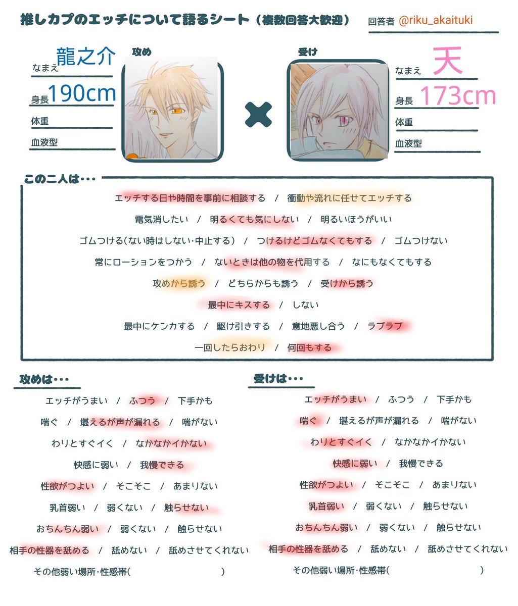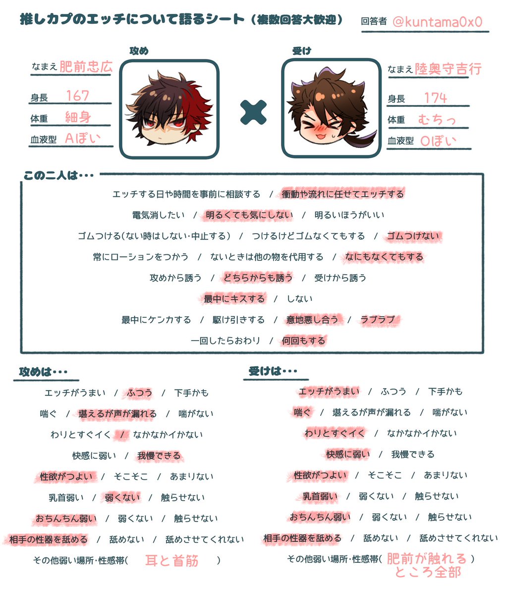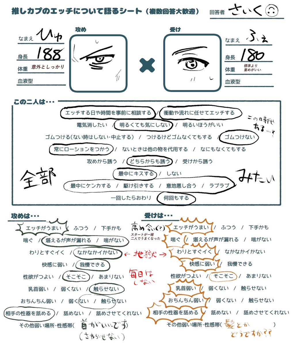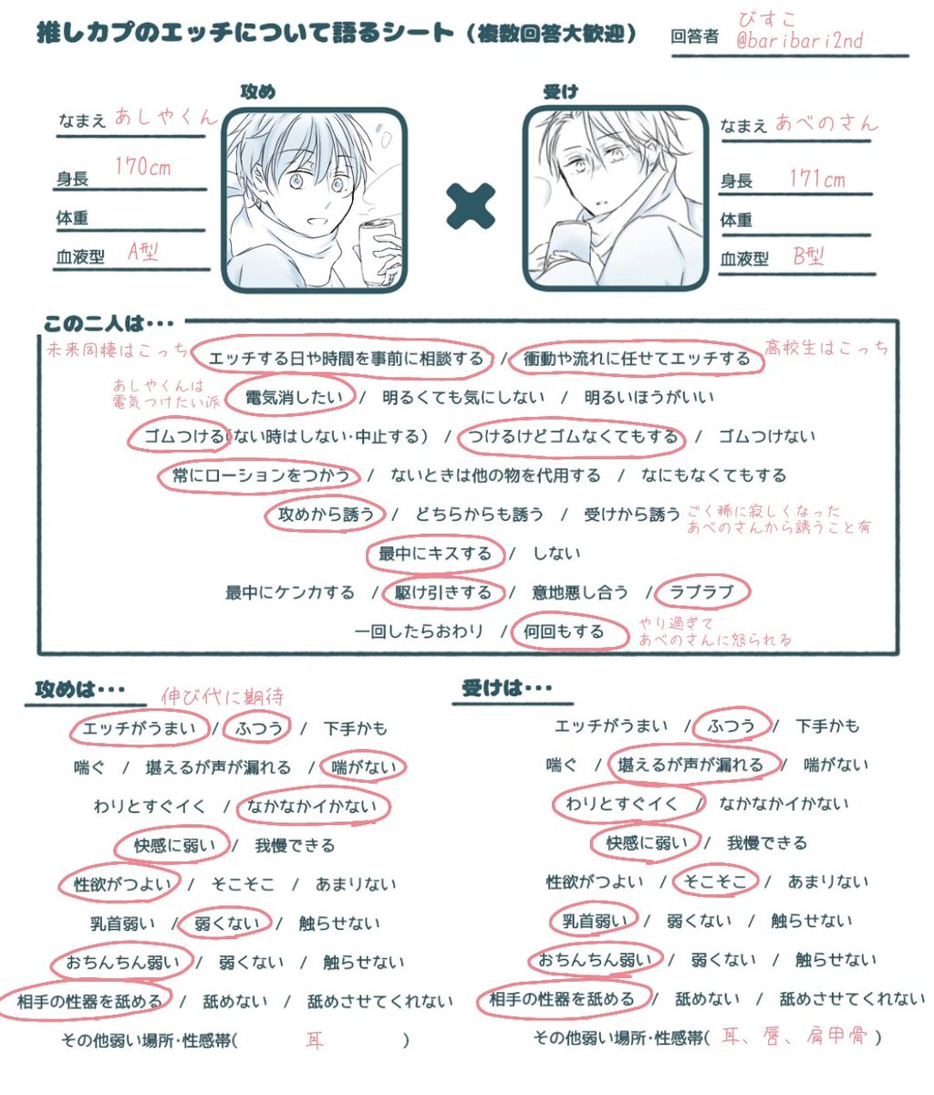 推しカプのエ…チの話をしたい&フォロワーが推しカプのエ…チの話をしてるとこ見たくて作りました・・・ どなたでも気軽に使ってください!項目を書き加えてもらっても大丈夫です!