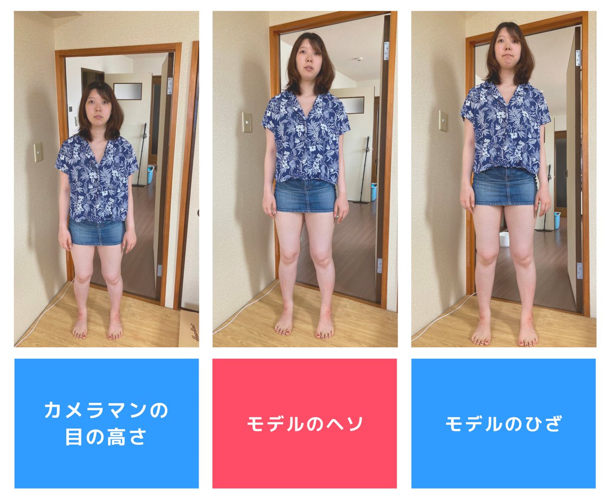 下から撮ると足は長く見えるけど顔は見下げる形になるのでイマイチになり上から撮ると顔は可愛く見えるけど足が短足になる。