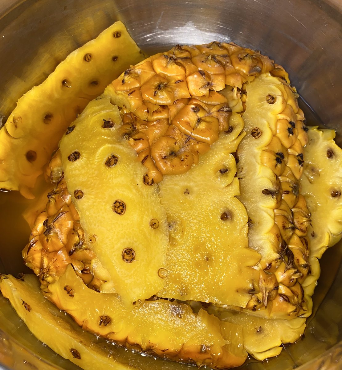貧乏性なので、台湾パイナップルの皮…勿体ない…と思って調べたら皮ごとミキサーにかけてジュースにしたり、煮てお茶にできるとあったので、よく洗って水+砂糖+レモンで煮て氷入れてジュースにしたら本体の実より家族に人気なくらい美味しい😂濃く作ったから炭酸割りも酒割も美味しそう