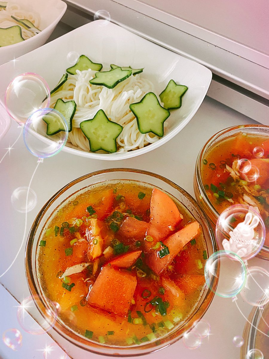 ツナ1缶、トマト1個、3倍濃縮麺つゆ大4、水230ml、オリーブ油大1/2、鶏ガラ小1、おろし大蒜小1/4、胡椒混ぜ素麺添える