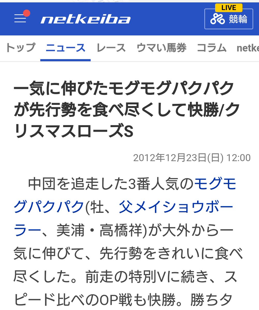 モグモグパクパクの馬主さんの過去の持ち馬に「モチ」って名前がいたんだけど、2007年の若駒ステークスで「モチが粘る!」っていう実況があるので、見てみて…。