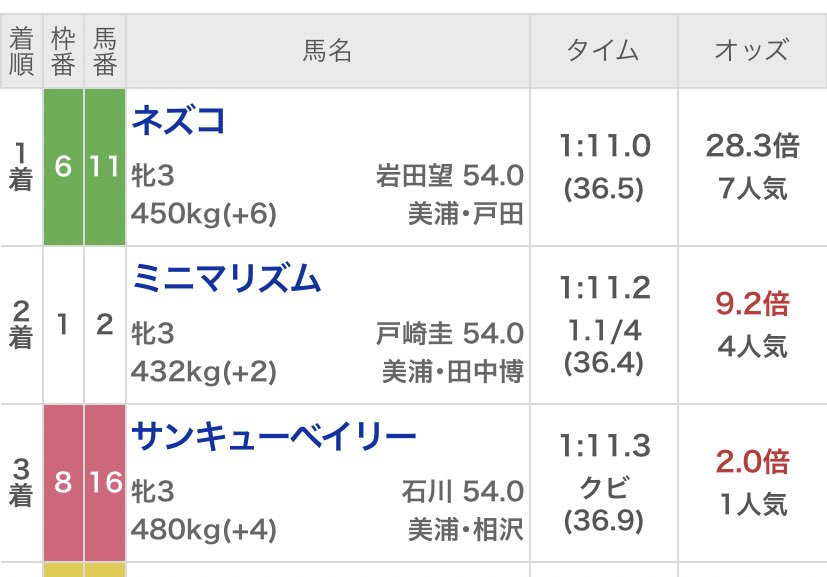 ちょうど今日の夜中に「中央競馬ダイジェスト」見てたら突然ネズコって出てきて「ん?」となってた(笑)。ちゃんと未勝利戦勝ち上がったみたいなので今後に期待。