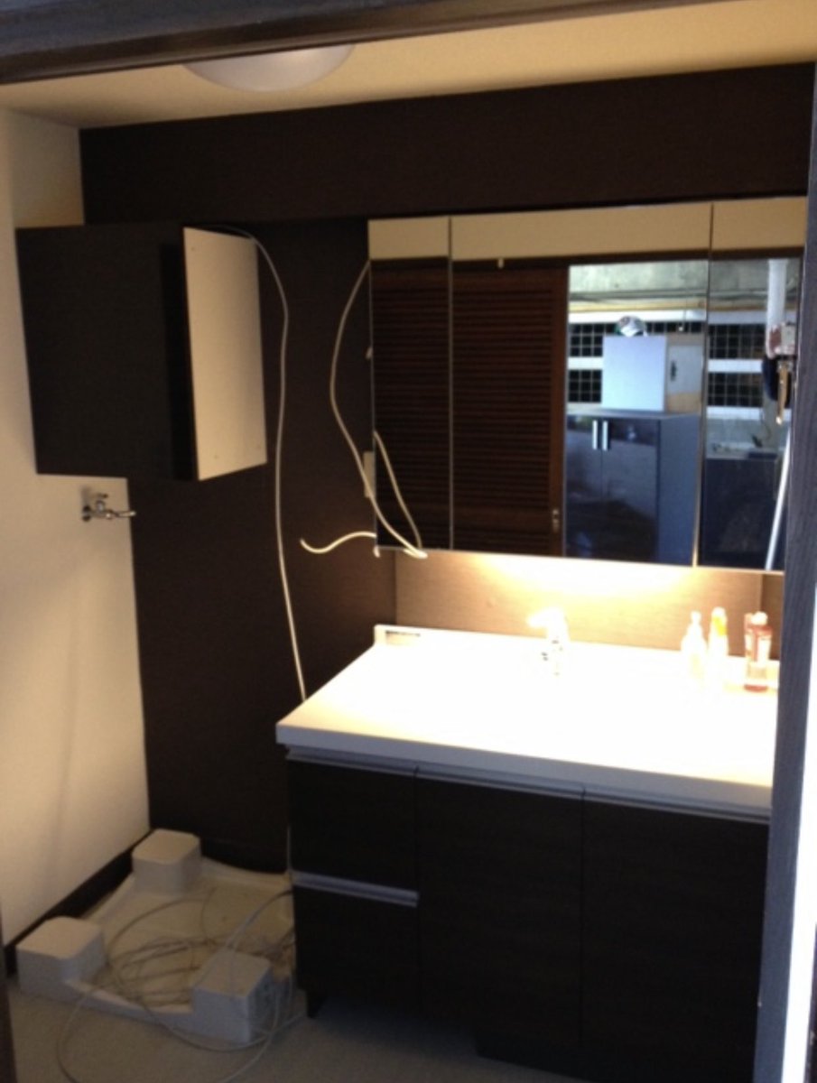 実家の洗面台はこの前更新した(設置場所の高さが少し特殊)けど、壁紙まで手が回らなかったのが残念。