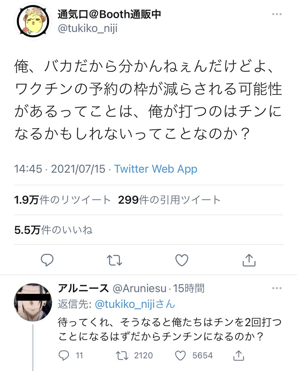2021.07.15 ツイート maruワクチンの予約の枠が減らされる可能性があるってことは、俺が打つのはチンになるかもしれないってことなのか? 通気口@Booth通販中@tukiko_niji俺、バカだから分かんねぇんだけどよ、ワクチンの予約の枠が減らされる可能性があるってことは、俺が打つのはチンになるかもしれないってことなのか?14:45 – 2021年07月15日返信リツイートお気に入り ツイートに対するネットの反応莱亜~raia~®️@TRH48@raia_1009ゴロリまでの流れが好き過ぎるww14:18 – 2021年07月16日返信リツイートお気に入りありごや@ウバ🥫@Tricolore_gori草14:10 – 2021年07月16日返信リツイートお気に入りmagyar istvan(低知能)@istvan0817アナルにチン打たれる(2度も)のヤダなあ。14:09 – 2021年07月16日返信リツイートお気に入りzan@z_a_nここだいすき https://t.co/JfdG1sRWqO13:36 – 2021年07月16日返信リツイートお気に入りkosuke@kosuke3932833爆笑www13:35 – 2021年07月16日返信リツイートお気に入りちいさ®︎🌸@dQXLlmBvJ3KJkiMイライラしてた心が浄化されたわ…13:21 – 2021年07月16日返信リツイートお気に入りけんせ@7/17BURST OF DESTINY@Kense_of_Flamesわらた13:17 – 2021年07月16日返信リツイートお気に入りふくやん(37)@fukuyanこういうのでいいんだよ12:56 – 2021年07月16日返信リツイートお気に入り 💰むにわゃ💰@y32imcワクチンチン12:52 – 2021年07月16日返信リツイートお気に入りかもめん@茨城県南サイドFIRE情報発信中@Kamomen_FIREこの問題に関しては 遺憾の「い」を表明してもらおう (あいうえお作文風)12:52 – 2021年07月16日返信リツイートお気に入り中崎まこと@makutu555天才あらわる>12:46 – 2021年07月16日返信リツイートお気に入りづみ@Izumiksnr飯粒吹いたw12:33 – 2021年07月16日返信リツイートお気に入り双極ねーやん⭐️🎹🎤🎹@pikamakikoクッソ…こんなので…12:29 – 2021年07月16日返信リツイートお気に入りリョーキ🐹👑@ryoki111フフ12:26 – 2021年07月16日返信リツイートお気に入り緒方リクドウ🅿️/kyokunP@Little_Triggerオメー東大生だな? おれは知能指数が高いからわかる。12:23 – 2021年07月16日返信リツイートお気に入り 健康診断怖い@haramawariyabaiつまり昨日私が打ったのはチンだった……?12:21 – 2021年07月16日返信リツイートお気に入りサブノカゲトラ(葉月影虎)@SABUNO_freedomワシ、こういうの嫌いじゃねえぜww12:21 – 2021年07月16日返信リツイートお気に入り夜詩乃みーてぃ@wumfyms0929ワクここで終わりなんでここから先はこれになりますね〜(ボロン12:20 – 2021年07月16日返信リツイートお気に入りかみつかい@The_paper_減らされたワクがどこにいったのかもわかんないんだろうな…12:17 – 2021年07月16日返信リツイートお気に入りエイプキング(25)@Zarukinaoki頭いいじゃないか…w12:13 – 2021年07月16日返信リツイートお気に入りヤマタク@近視@ymtk_vocDr分かってんじゃん♂12:10 – 2021年07月16日返信リツイートお気に入りガムシロ@Ra5g6cdyhJZXMW1一回目二回目同じ接種するから、世の中に ワクワクさんと チンチンさんだらけになる😆12:09 – 2021年07月16日返信リツイートお気に入り モーリー@家族揃って異世界転移しました@isekaifamily天才だろ11:55 – 2021年07月16日返信リツイートお気に入りいけぺ~@ikepe_mainわろた11:37 – 2021年07月16日返信リツイートお気に入り袋小路彦吉@hikota827山田くん、一枚差し上げて。11:36 – 2021年07月16日返信リツイートお気に入りさでお@KENZENGER_Zくっ…面白すぎる…俺が最初に言ったことになんねぇかなぁ…!!11:30 – 2021年07月16日返信リツイートお気に入りリリカル由貴ちゃん’s/ぽんた@ponta__yukiチンチン11:28 – 2021年07月16日返信リツイートお気に入りきっかひおりの雑多垢@tenka0amayakasi賢いこと言うのかと思ったら上手いこと言うバカで草11:16 – 2021年07月16日返信リツイートお気に入りパスタ職人なめこ汁先生@name_ouijaboardフローバグ起こして天才になった模様11:16 – 2021年07月16日返信リツイートお気に入り春樹@クラウド勉強中(⊃•̀ω•́)⊃✎@hal3086草11:11 – 2021年07月16日返信リツイートお気に入り家族家十入@ザザプラス師匠P@33rdtravelerうーん、面白いけどあまりわくわくしないお話でございますな!11:08 – 2021年07月16日返信リツイートお気に入りうめ@tumeta2面白い。10:59 – 2021年07月16日返信リツイートお気に入りメデューサの瞳@medouppoidそうなってくると2回打たなきゃいけないってのは、つまりはそういうことなのか…10:53 – 2021年07月16日返信リツイートお気に入りもにゃ(公式)@monyanya12マジでバカだな(褒めてる)10:53 – 2021年07月16日返信リツイートお気に入りアガベ@yasu_agaveなんでいい事言いそうな口ぶりでデスゲームで最初に死にそうな役みたいな台詞言っちゃったの、この人10:50 – 2021年07月16日返信リツイートお気に入りあまつかちゃん@10キロ増@o4no_liveいいえ、お客様の場合2回目の摂取は確実に含まれておりますので チン、ではなくチンチn10:43 – 2021年07月16日返信リツイートお気に入りテンペンロイド@やがてVになる@numazuJK_Tem二回枠が減らされたらチンチンなってしまう10:42 – 2021年07月16日返信リツイートお気に入りあさ