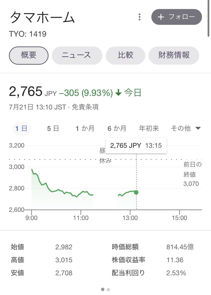 今回のタマホームみたいな、社長が無能だと思われたパターンだと大暴落してる