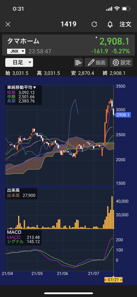 コロナショック下で資材費光熱費人件費高乗り越えてアメリカと日本の住宅着工件数が共に絶好調。不動産業界は地価は下落せず都心部賃貸物件は値上げトレンド。タマホームは好決算を叩き出したばかりと下がった要因が100%トップ発言なのでどう見て仕込み時お買い得バーゲンサービス銘柄ですがな。