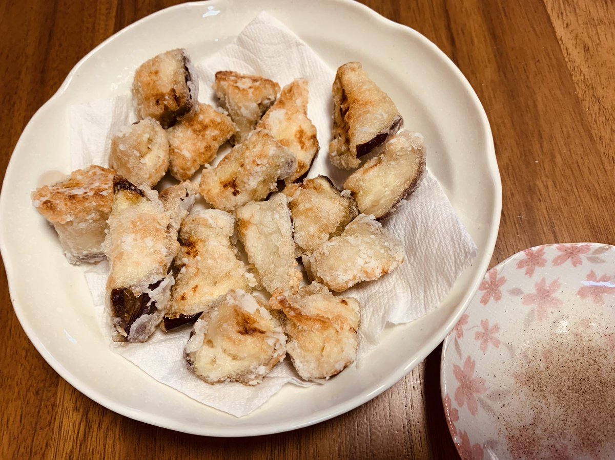 ナス料理のレパートリー定番化してしまっていて、ナスの唐揚げどんなの出来るのかな〜と作ってみた。
