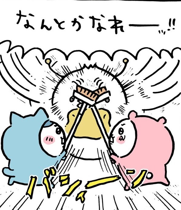 怪鳥が翼をバタバタしている間(ウサギ氏は咄嗟にジャンプして避けた!!)、ちいかわちゃん&ハチワレちゃんがWで箒攻撃!!