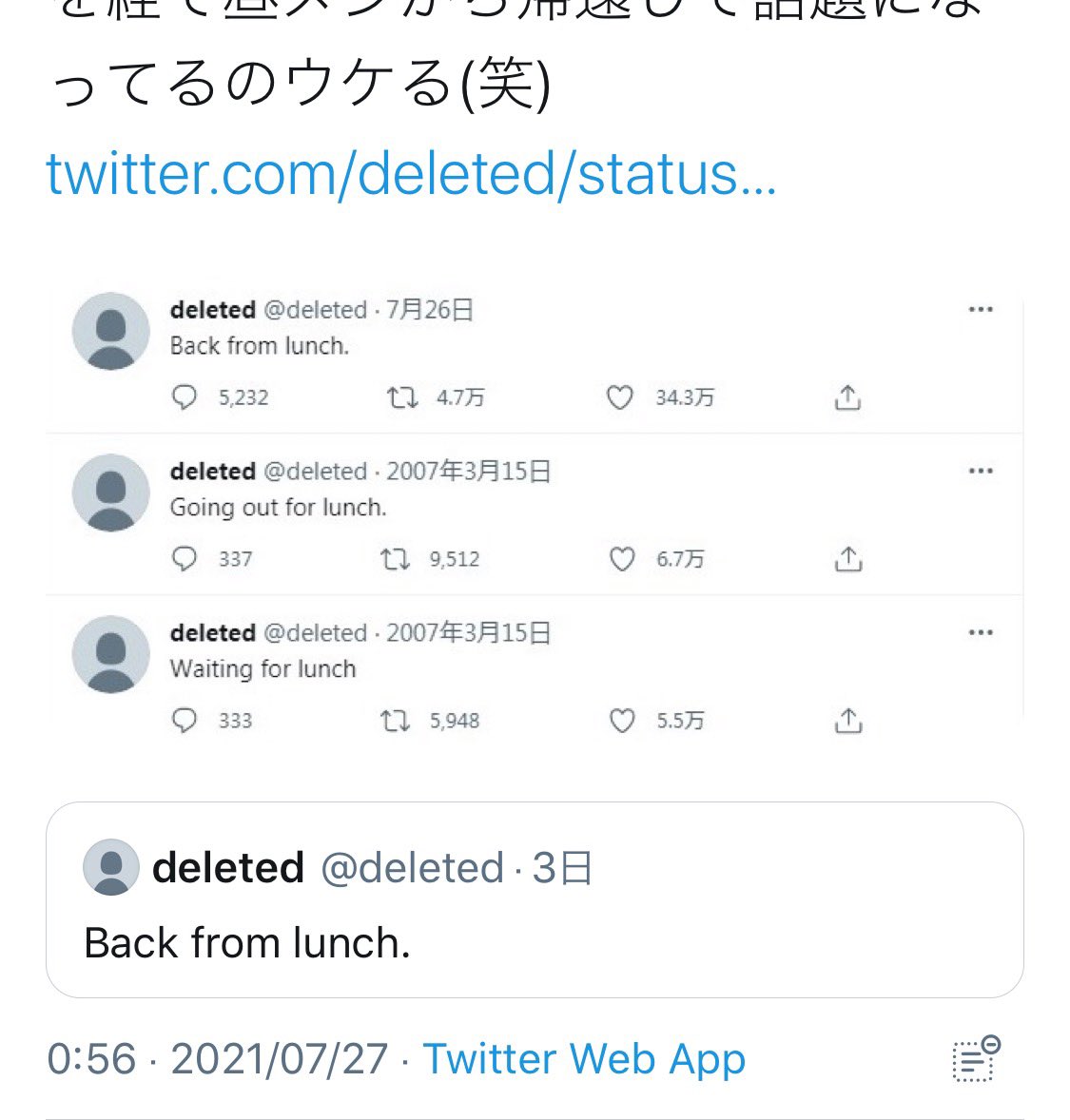 2007年3月15日に「昼メシ食いに行ってくる」と言い残し更新が途絶えていたアカウントが、14年と133日を経て昼メシから帰還して話題になってるのウケる(笑)