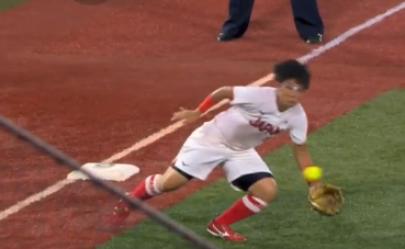 これはもう神が弾かせた、としか思えない。ふつうのサードライナーだったら2塁走者はあそこまで飛び出してないだろうし、真後ろに弾いてたらレフト前ヒットで本塁はクロスプレーで1点差、ランナー2塁で引き続き米国の攻撃になっていたかも?