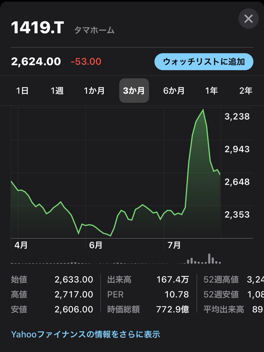 タマホーム今日でめちゃ下がってるのかと思ったら直近で株価上がってるので底値ではないらしい。 https://t.co/XQtFS3c2So