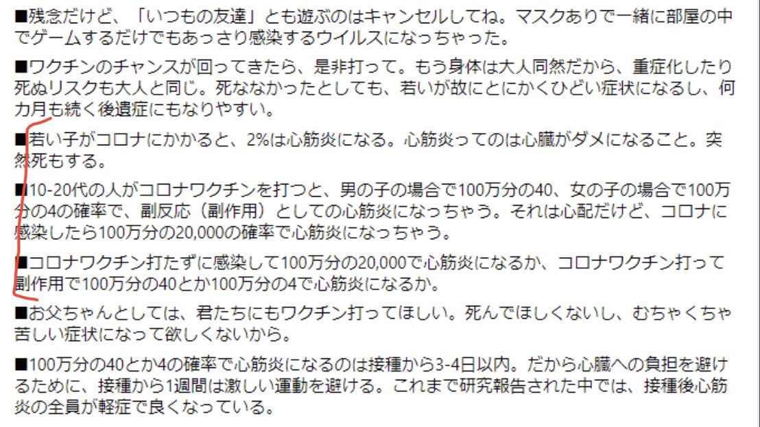 わしは子供に同じような話をした。外国やイスラエルのデータ、日本の官僚や政治家やマスコミがどのような利害で動くか。情報戦争とは、ウイルスや抗体とは、従来のコロナと何が違うか、と言う事を自身も理解し説明した。高等教育を与えていて本当に良かったと思う。我家は誰一人ワクチンは打たない。