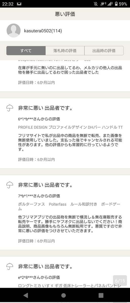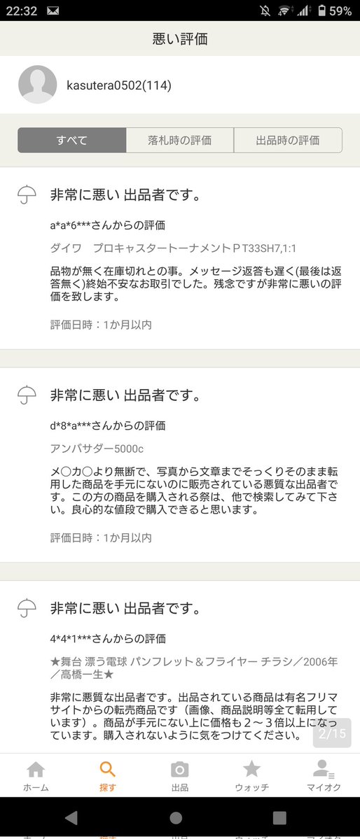 俺もしてやろうかしら?因みにコイツも無在庫転売ヤーなので注意喚起!俺が別所で扱ってる物を数万色つけてヤフオクに出してる模様他も検索すると出るわ出るわだし悪い評価も推して知るべし…質問で警告したらそくブラックリスト突っ込まれて、ヤフオク側は何度も通報しましたが対応される気配無し https://t.co/SAroi2VcVl