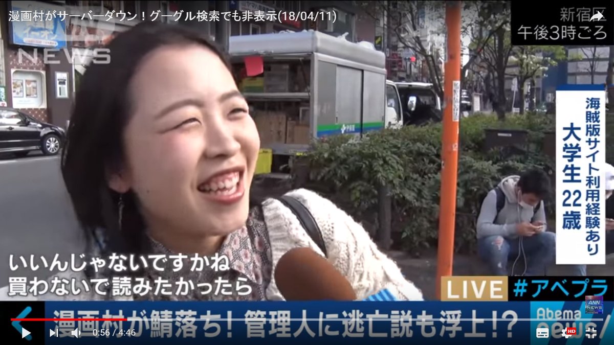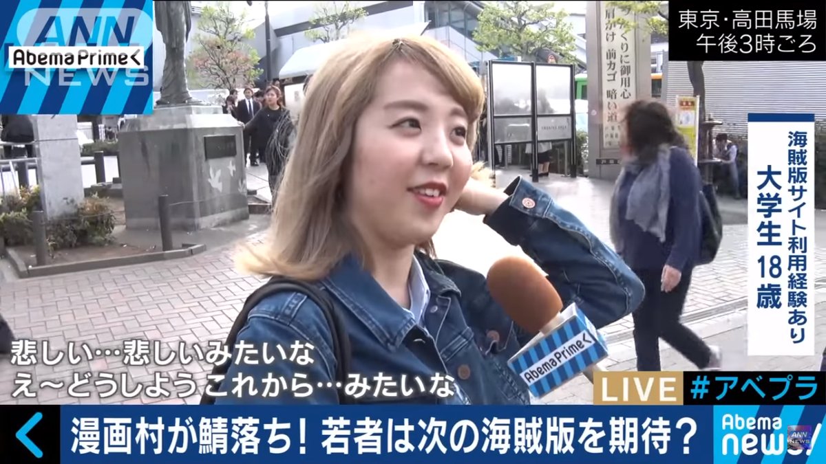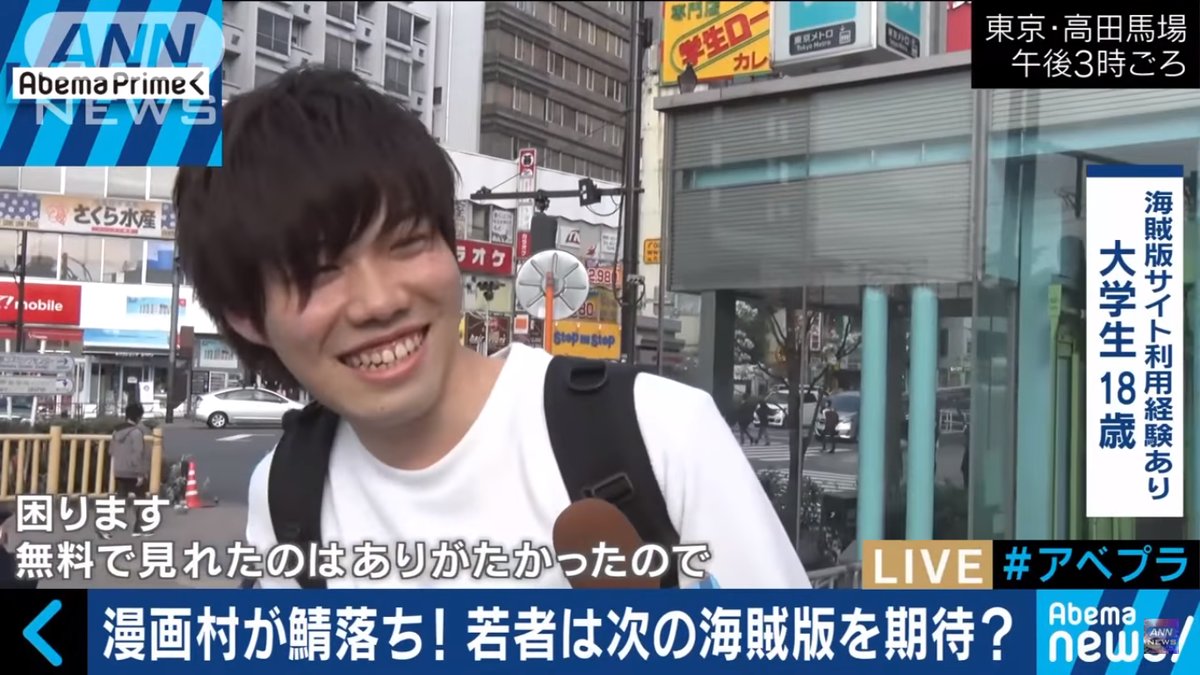 2018.04.12 ツイート maru漫画村閉鎖のニュースを見てたら漫画村を使ってる大学生が平気で顔出しでインタビュー受けててさすがに頭が悪すぎる 罪の意識がないのか… 空飛ぶピザ@soratobu_piza漫画村閉鎖のニュースを見てたら漫画村を使ってる大学生が平気で顔出しでインタビュー受けててさすがに頭が悪すぎる 罪の意識がないのかね #漫画村 03:17 – 2018年04月12日返信リツイートお気に入り
