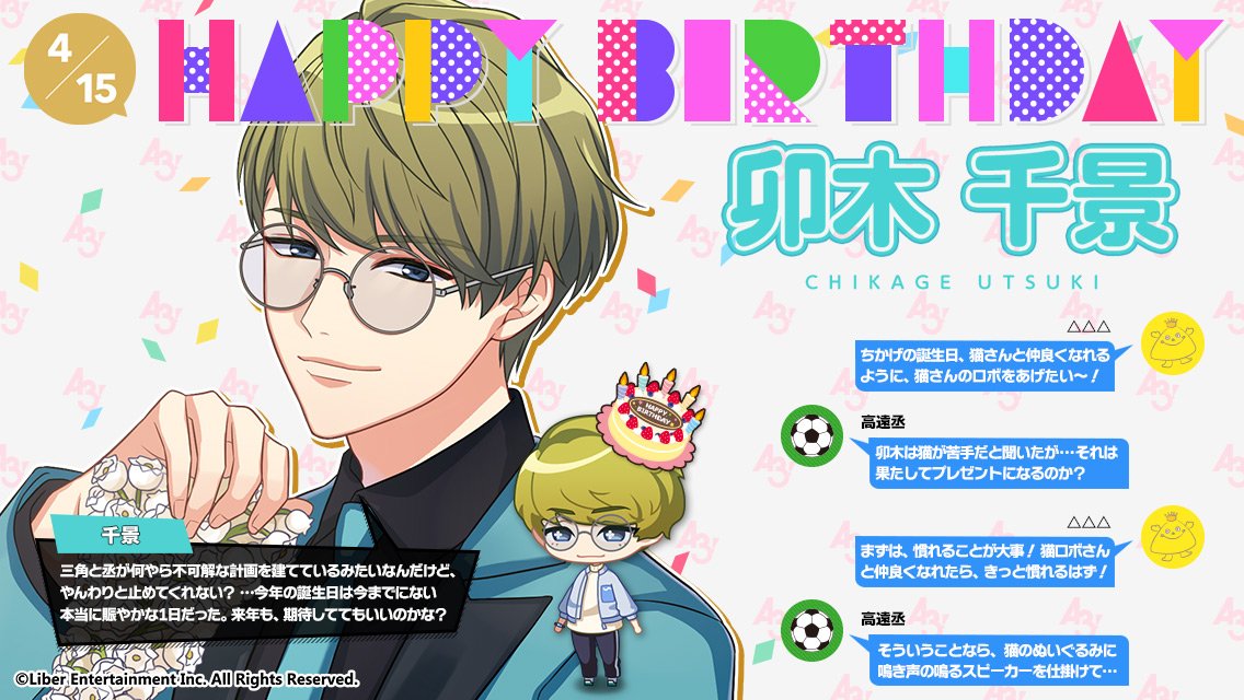 今日は春組・卯木千景くんの誕生日です!当初は謎だらけだった彼も劇団に入って少しずつ色々な面が見え始め、意外な「弱点」も発覚。どうしても克服してほしい三角くんの、丞くんを巻き込んでの計画はこのあと見事阻止されてしまったようです。 #エースリー