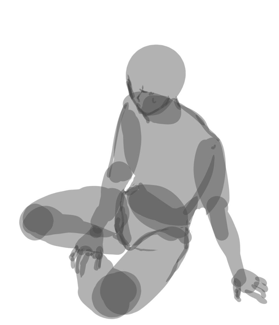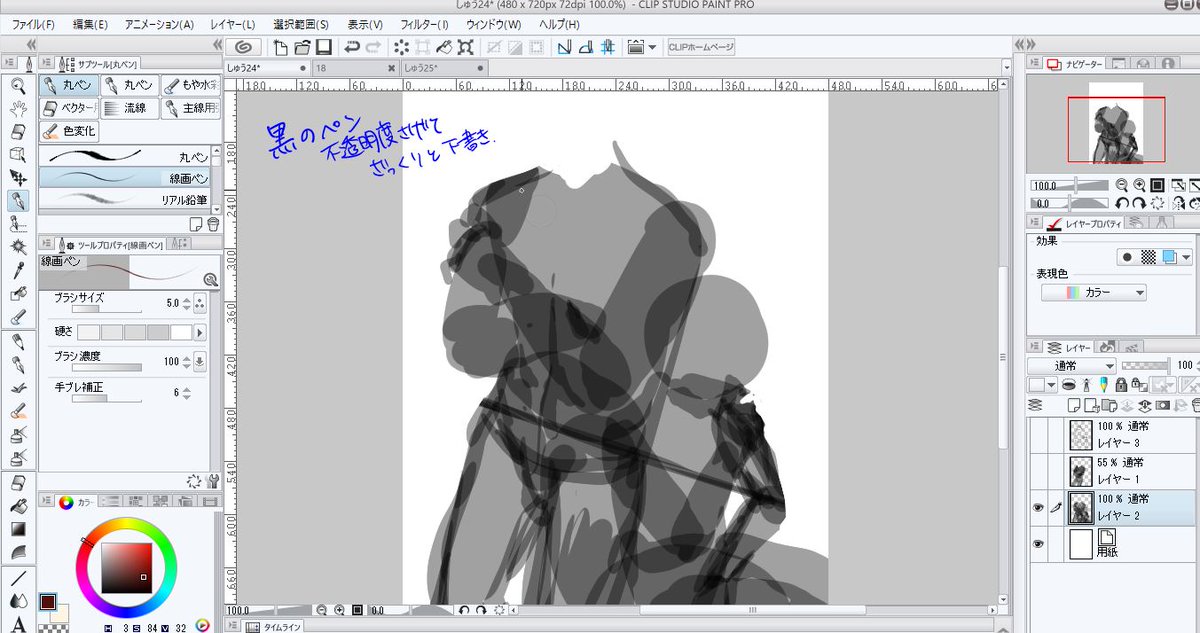 めっちゃ太いペンのサイズで不透明度薄くして、体のパーツひとつずつ描いてくやり方です