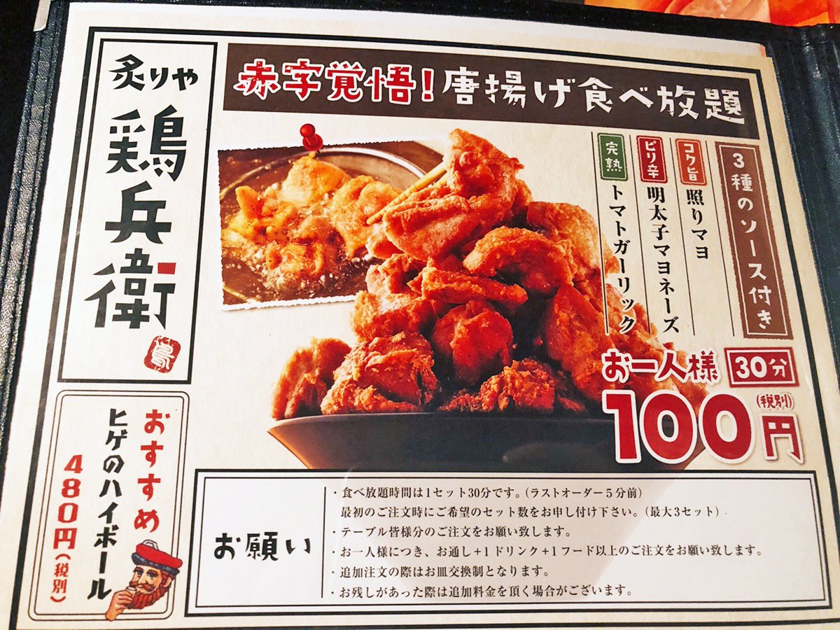 【炙りや鶏兵衛】 @上野,町田など 100円で唐揚げが食べ放題のお店。 1ドリンク&1フードを頼むと唐揚げが食べ放題になり、揚…