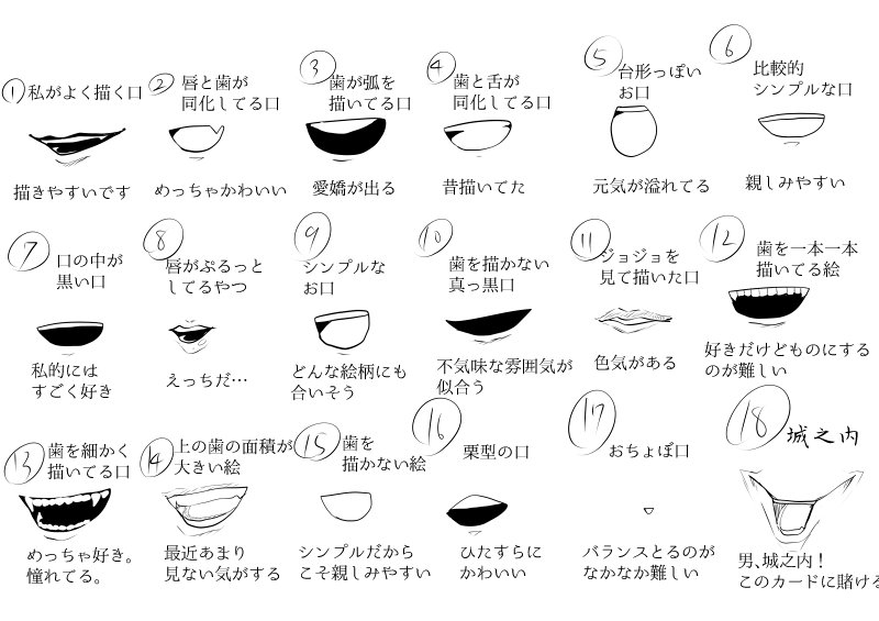 2018.05.19 ツイート maruそういやツイ消ししちゃったんで、再投下。 口の種類についてどうこう。 沙木直樹@saginaoki819そういやツイ消ししちゃったんで、再投下。 口の種類についてどうこう。19:02 – 2018年05月19日返信リツイートお気に入り ツイートに対するネットの反応むーちょん@mushin_bt2番の口好き https://t.co/WlCxoc41az19:09 – 2018年05月20日返信リツイートお気に入りやわらか聖騎士ねすお@_Nesuo(*´◒`*)ひたすらにかわいい https://t.co/dDDoenUXn817:48 – 2018年05月20日返信リツイートお気に入りトンガリアゴーン@MxgC3お!?お!? あとめだか口も見たかったなぁ( ͡° ͜ʖ ͡°) https://t.co/yifqv1zbz116:42 – 2018年05月20日返信リツイートお気に入りIb_執行済@0911_ky_0109オチが最高 https://t.co/SmtOA9zHZP16:24 – 2018年05月20日返信リツイートお気に入りおいもさん@oimo_sun1120城之内は草 https://t.co/ygnC6s1Fg515:14 – 2018年05月20日返信リツイートお気に入り冷風@Re043_13番めっちゃ好きなの伝われ https://t.co/pbUsAQ1mVR14:18 – 2018年05月20日返信リツイートお気に入りあまねく.*✿専属絵師体育祭団旗の下書き@amnkri_kzk0504城之内の需要www https://t.co/v8eY9qs6Pg14:02 – 2018年05月20日返信リツイートお気に入りはるの@yutakanakanata8番…えっちだ… https://t.co/kmbhjCm3e913:45 – 2018年05月20日返信リツイートお気に入り潮音うた@小宮有紗5thファンミ両部参戦@sioneuta1324最後吹いた https://t.co/N4mhypqkpx12:29 – 2018年05月20日返信リツイートお気に入りフィン・マーシャル@まつたけ@matutake_pbwシンプルかつ特徴のある口の種類。 私は口を描くのが苦手だから練習しないと…… https://t.co/MXh9fy6Wv511:21 – 2018年05月20日返信リツイートお気に入りかのこうたのこ@kanokoutanoko最近は口の中を書き込むことおおい……歌わせようとすると特に https://t.co/2OzAnhlKbS11:12 – 2018年05月20日返信リツイートお気に入りまかろに@Darkgirl_Maka色々あるんだなァ… ちなみに俺は⑮しか描いてない気がしますぞ https://t.co/AgAp6EG1Gf09:11 – 2018年05月20日返信リツイートお気に入り不知火@saoayaka地味~に勉強になる( ̄▽ ̄) https://t.co/SGt3T1FyHW23:43 – 2018年05月19日返信リツイートお気に入りそらしろ@euclid1125VI18ばんすき https://t.co/9NMrMUf2Uv21:57 – 2018年05月19日返信リツイートお気に入り艱難辛苦の夢咲りんご@aoisora2525mm俺どれ? https://t.co/H7pbVp37CC19:10 – 2018年05月19日返信リツイートお気に入り黒呂マ グロウ@SmithWM08018、13、14が多い気がする。特に多いのが8 https://t.co/F36DRPgSuf19:09 – 2018年05月19日返信リツイートお気に入り